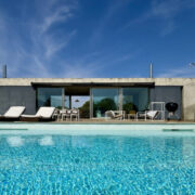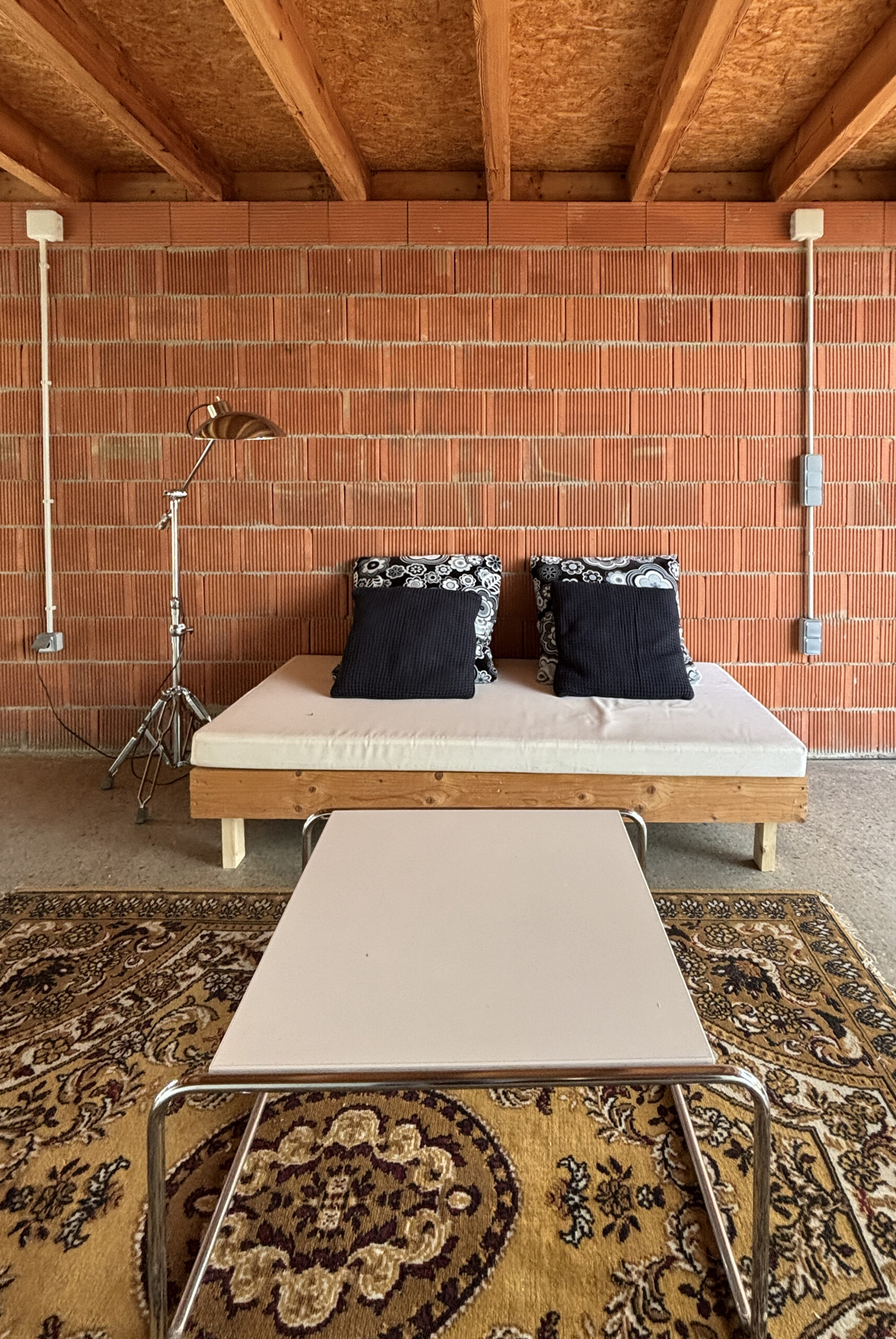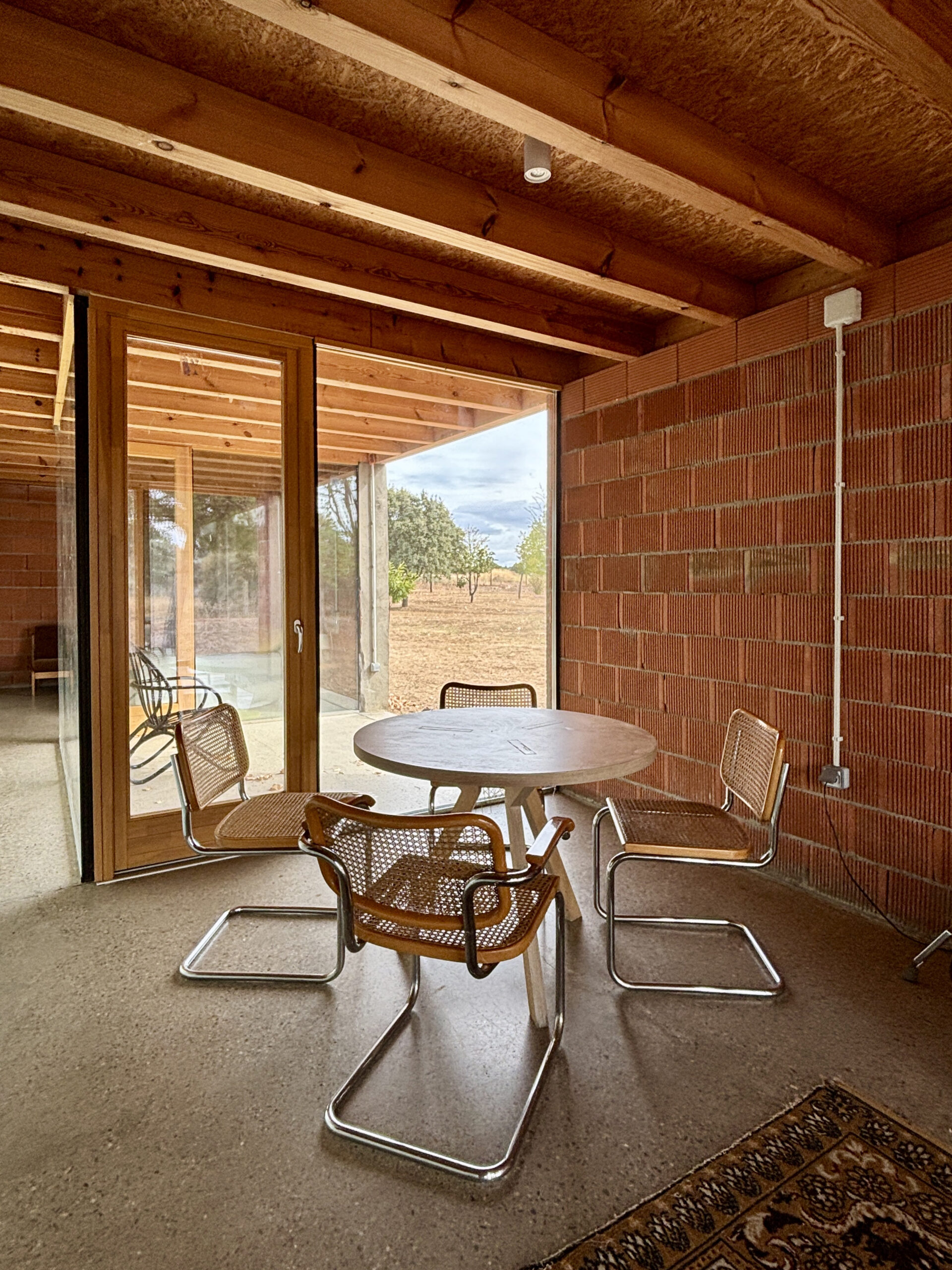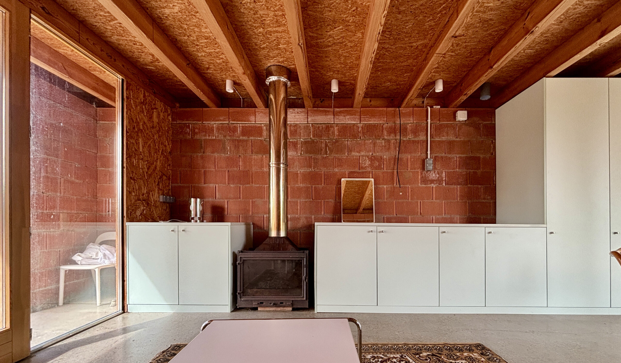 Su construcción responde a una filosofía de economía y sostenibilidad: suelos de hormigón pulido, muros de termoarcilla vistos en el interior y techos con estructura de madera que muestran la nobleza de los materiales en estado puro. La cubierta ajardinada, los patios térmicos y el aislamiento natural reducen la demanda energética, permitiendo climatizar el espacio con una simple chimenea de leña.